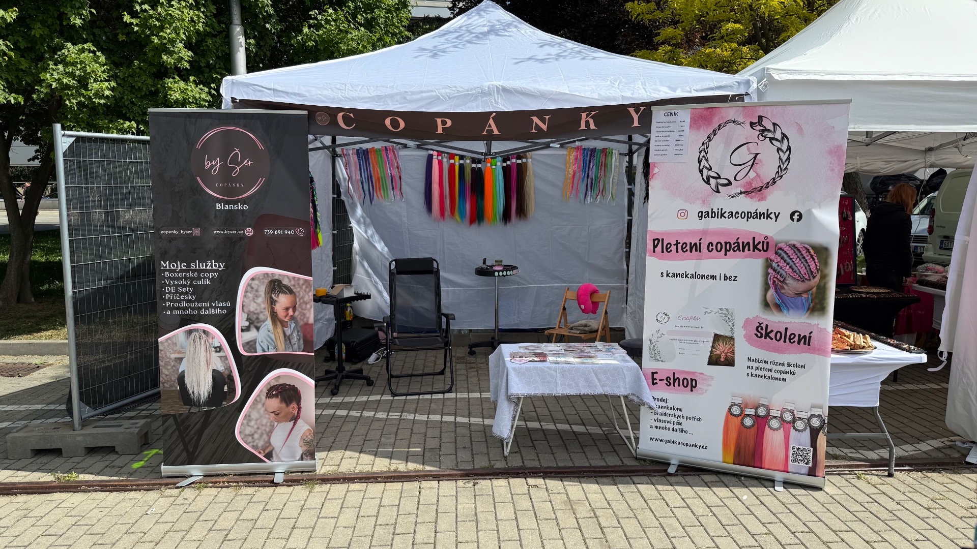 S jednou šikovnou braiderkou jsme se rozhodly, že se zkusíme vetřít do programu. Prostě jsme oslovily organizátory a nabídly jim, že bychom mohly česat copánky přímo na akci. A ono to vyšlo! Ale teda ne zadarmo – podmínek jsme měly víc než dost a nebyly to úplně drobnosti. Byla jsem chvílema nervózní, jestli to všechno dáme, jestli si nás vůbec někdo všimne, a jestli to celý bude stát za to. A Stálo! A jak! 🙌